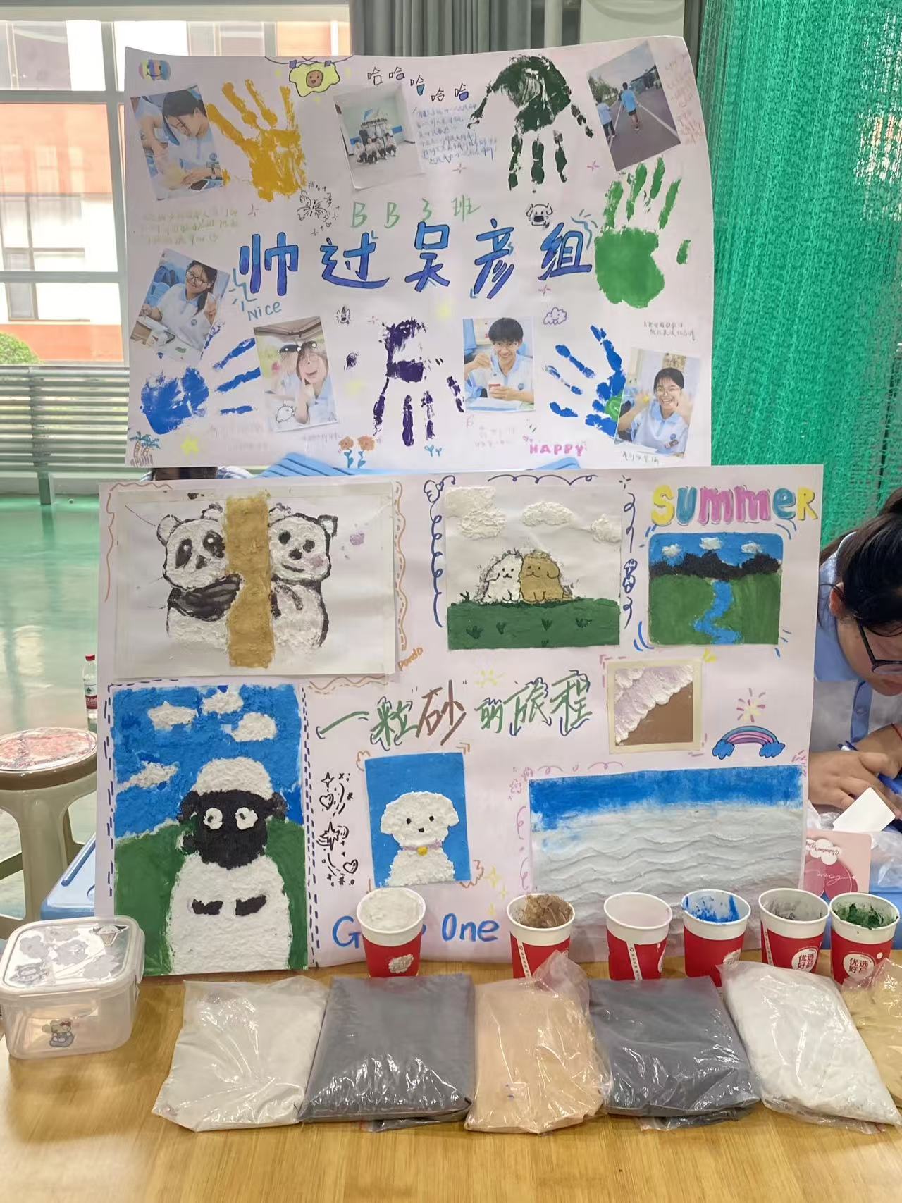 真正画起来,才知道有多难:沙子总不听使唤。我们围着桌子反复试,一点点摸索,总算让每幅小画都有了模样。看着那些不完美的线条和色块在拼接处慢慢相融,心里的欢喜像潮水一样漫上来。